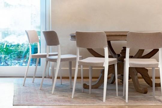 Materials: Stacking side chair in polypropylene. Seat and back upholstered with fabric or leather.