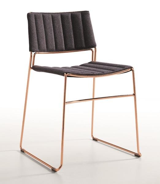 Materials: Side chair with lacquered steel rod frame. Fabric or leather upholstered seat and back. Stacks 8 chairs high.